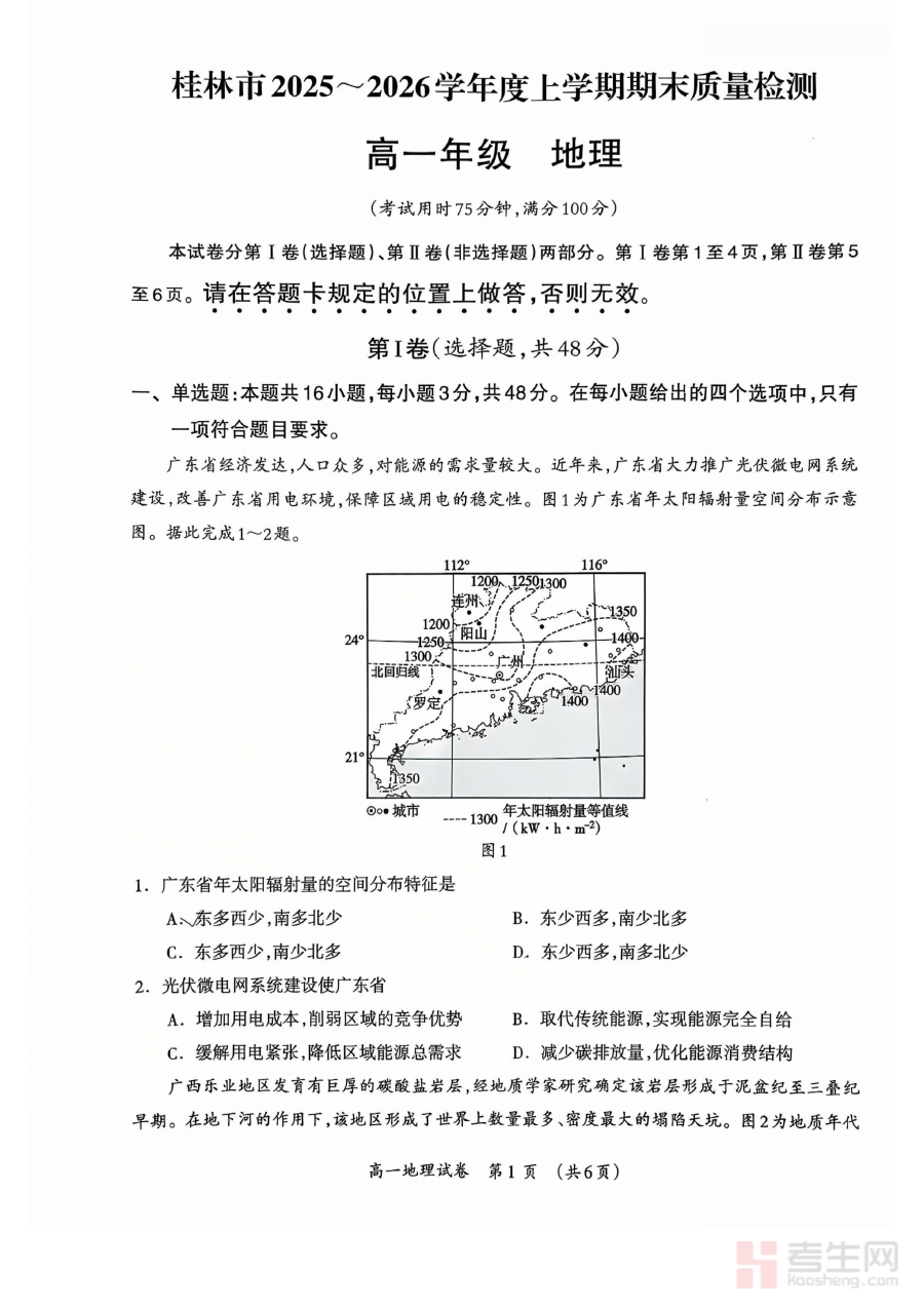 该试卷适用于桂林地区2025-2026学年秋季学期在读的高一学生及承担该阶段地理教学任务的教师。对于学生,使用该资料可巩固本学期所学地理知识,提升应对期末检测的能力;对于教师,可借助其开展针对性的教学评估与复习指导。整体而言,该资料在高一地理阶段性检测与期末备考规划中具有实用价值,能促进教与学的协同提升。