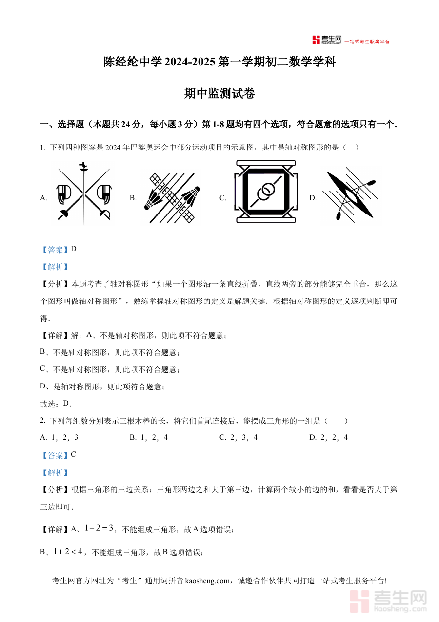 《精品解析:北京市陈经纶中学2024-2025学年上学期八年级期中数学试卷(解析版)》是针对北京市陈经纶中学特定学年学期的八年级期中数学考试打造的专业备考资料。它聚焦该中学当学期八年级数学期中检测的核心需求,依托官方试卷内容展开系统解析,为使用者提供与实际考试紧密对接的学习支持,帮助其精准把握期中数学考试的命题方向与考查重点。