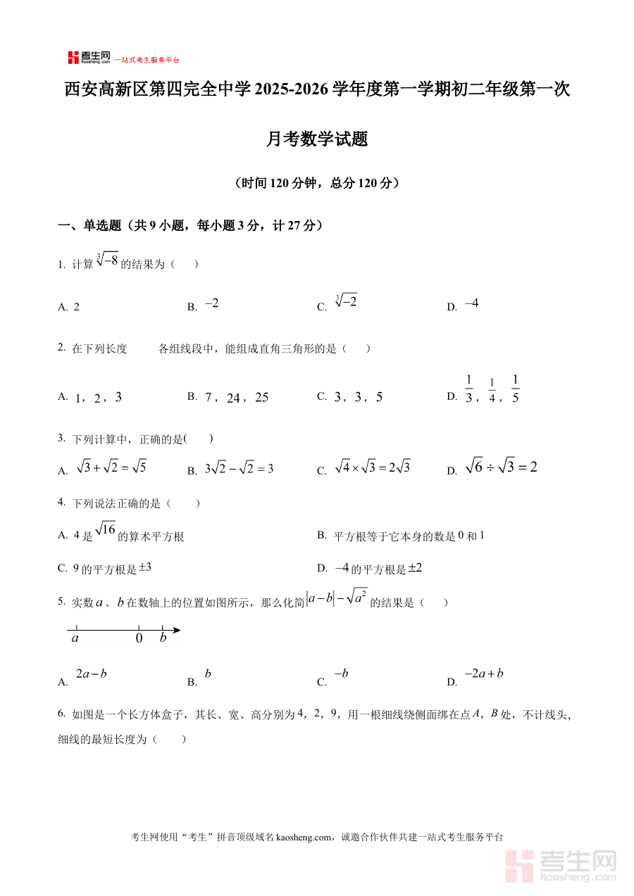 《精品解析:陕西省西安市高新区第四完全中学2025-2026学年八年级上学期第一次月考数学试题(原卷版)》是针对陕西省西安市高新区第四完全中学特定学年学期初阶段数学学科月度检测的备考资料。该资料以原卷版形式呈现,精准对应该校2025-2026学年八年级上学期第一次月考的数学考查需求,为使用者提供了贴合该校教学进度与考查方向的原始试卷素材,是了解该次月考数学科考查框架的直接参考依据。