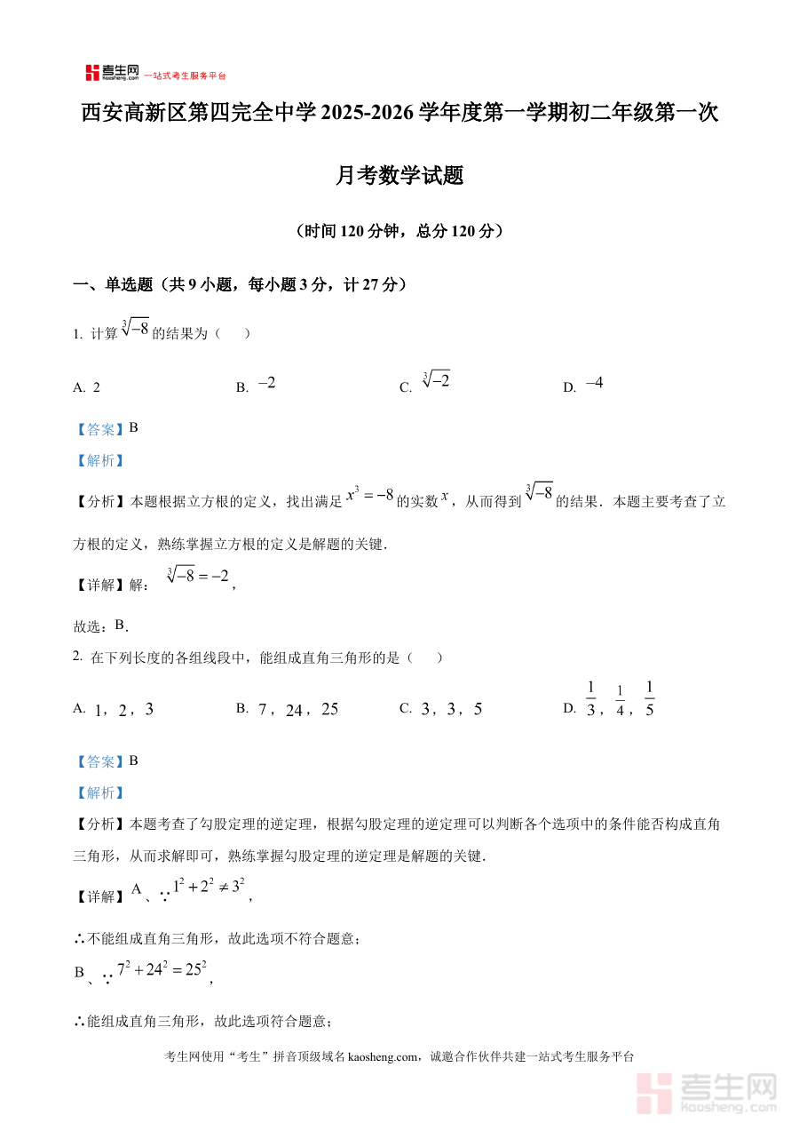 《精品解析:陕西省西安市高新区第四完全中学2025-2026学年八年级上学期第一次月考数学试题(解析版)》是针对陕西省西安市高新区第四完全中学在2025至2026学年八年级上学期开展的首次月度数学检测所编制的配套解析资料。该资料依托学校阶段性教学进度与检测需求,聚焦八年级上学期初期数学学习内容的考查方向,为使用者提供与本次月考直接相关的系统性解析支持,是贴合该阶段教学评价场景的专业备考资源,能够帮助使用者快速把握本次检测的核心导向与评价标准。