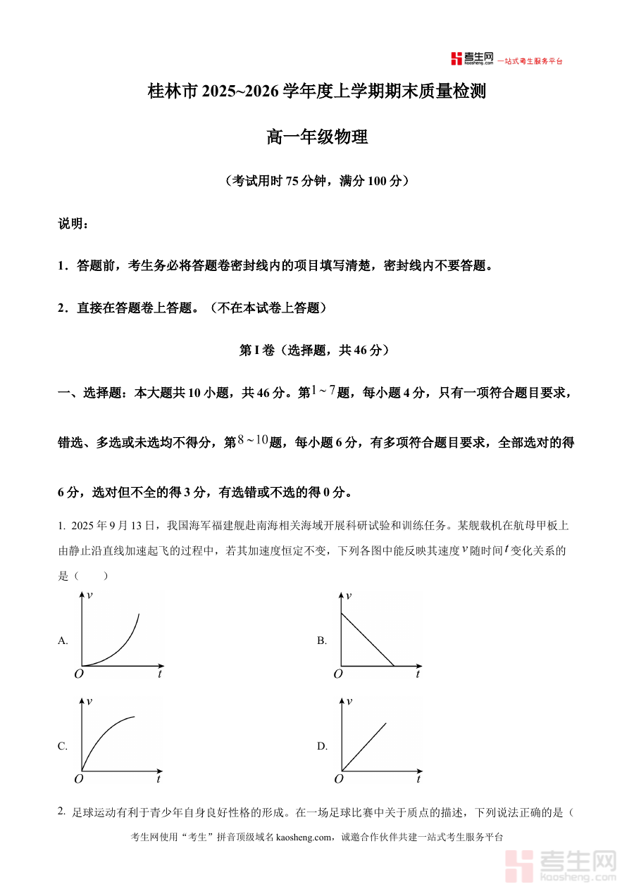 《广西壮族自治区桂林市2025-2026学年高一上学期1月期末物理试题(含解析)》是针对广西壮族自治区桂林市高一学生2025-2026学年上学期期末阶段的物理学科考试资料,契合该地区高一物理教学进度与期末检测要求,为学生提供贴合本地考情的备考支持。