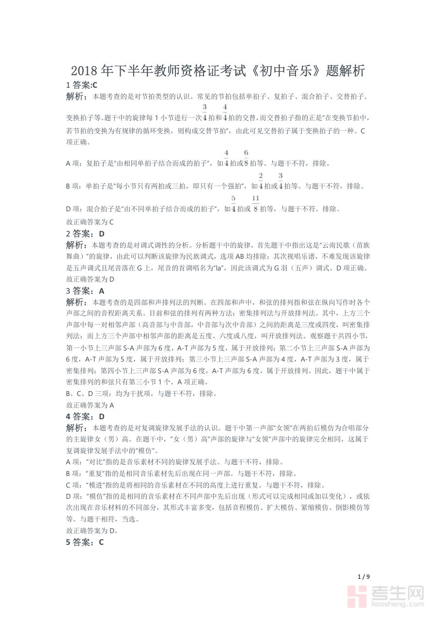 该资料适用于所有备考2018年下半年初中音乐教师资格证考试的考生,特别是希望通过题目解析来强化知识掌握、熟悉考试题型特点的考生。其解析内容能够为考生提供专业的指导,助力考生在备考阶段进行有效的阶段检测与知识巩固,从而提高备考效率,增强应试信心。