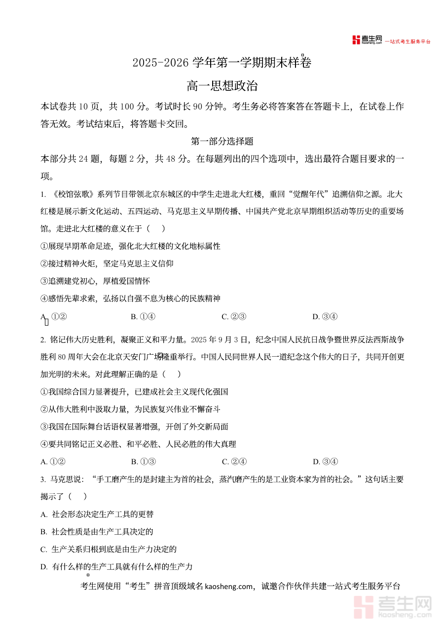 《精品解析:北京市东城区2025-2026学年高一上学期1月期末考试政治试题(原卷版)》是针对北京市东城区2025-2026学年高一上学期1月政治期末考试的备考资料,贴合该区域高一政治教学进度与本地考试要求,为学生提供与期末考试直接相关的原卷内容参考。