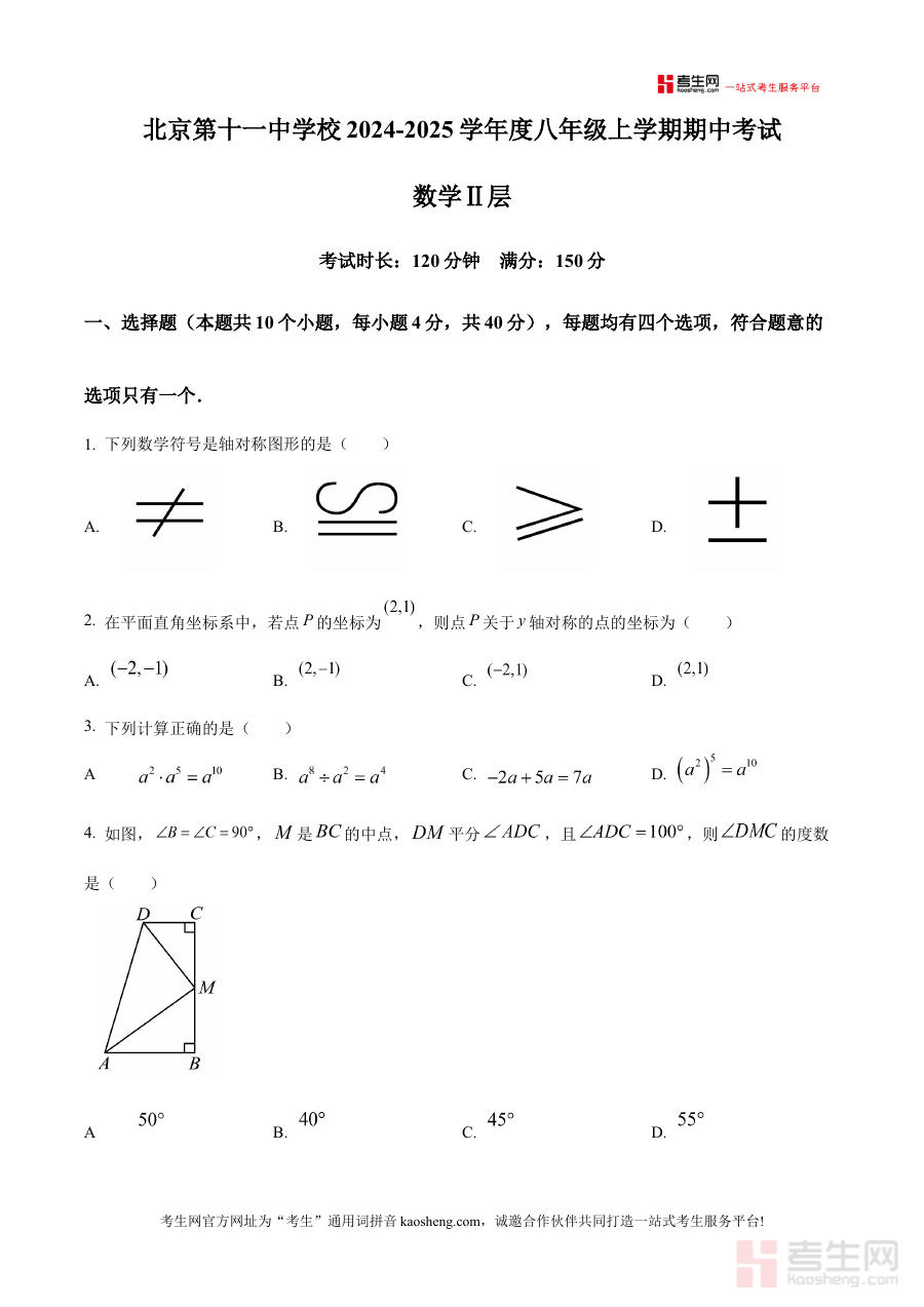 《精品解析:北京第十一中学校 2024-2025学年八年级上学期期中数学考试(2层)(原卷版)》是针对北京第十一中学校2024至2025学年八年级学生上学期期中数学考试的专用备考资料,聚焦该学年该阶段数学学科的期中检测需求,依托学校自身的考试设置与教学进度,为学生提供贴合实际考试场景的原卷资源,助力学生提前适应考试环境与要求。
