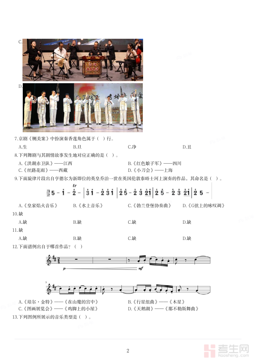 《2023年上半年教师资格证考试《初中音乐》题(28-31题缺失)》是2023年上半年面向初中音乐学科的教师资格证考试真题类备考资料。该资料基于该次考试的实际命题框架编制,尽管存在28至31题缺失的情况,但仍完整保留了大部分考试内容的核心结构、考查维度与命题风格,能够为考生清晰呈现该次考试的整体脉络与考查重点,帮助考生快速建立对初中音乐教师资格考试形式与内容体系的直观认知,是备考阶段中了解考试特征、熟悉考查方向的重要参考资料。