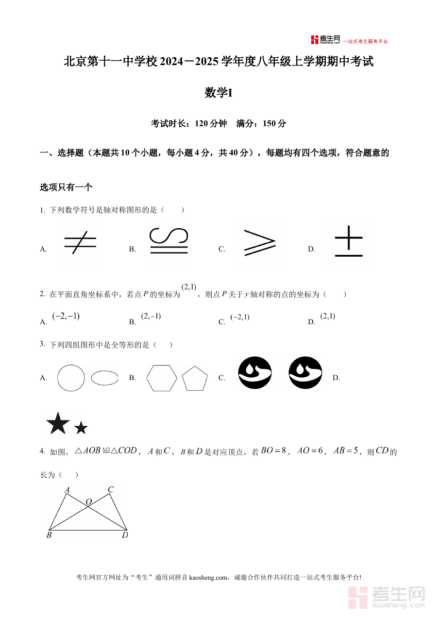 《精品解析:北京第十一中学校 2024-2025学年八年级上学期期中考试数学试卷(1层)(原卷版)》是北京第十一中学校针对本学年八年级上学期期中考试推出的数学原卷版备考资料,精准对应该校特定学年与学期的阶段性考试需求,能够让使用者直接接触到该校期中考试的原始试卷形式,为备考提供真实的参考依据。