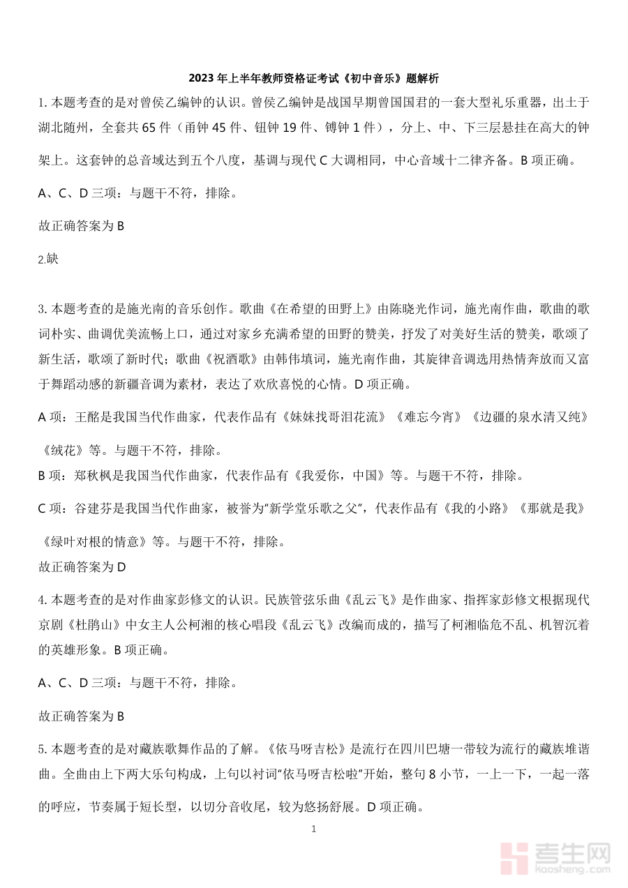 《2023年上半年教师资格证考试《初中音乐》题(解析)》是2023年上半年针对初中音乐学科教师资格证考试的备考资料,包含该次考试的试题及对应的解析内容。作为教师资格证考试备考体系中的关键辅助材料,它紧密贴合当次考试的学科方向与考查维度,为备考者提供了直接关联考试实际场景的学习素材,帮助备考者快速熟悉考试的基本框架与核心要求,搭建起理论知识与考试实践之间的桥梁。
