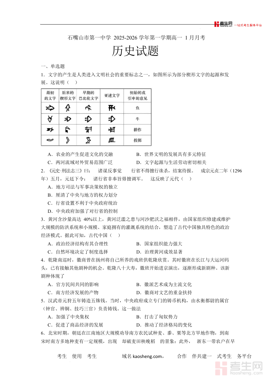本试卷适用于石嘴山市第一中学2025-2026学年高一年级学生,通过完成该试卷,学生可有效检验自身对高一上学期历史知识的掌握程度,及时发现学习漏洞并进行针对性补强,对提升阶段学习效率与备考质量具有重要参考价值。