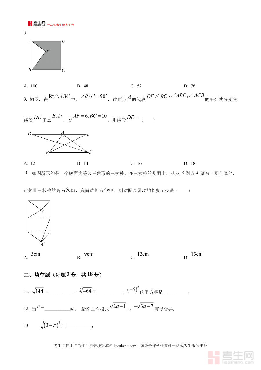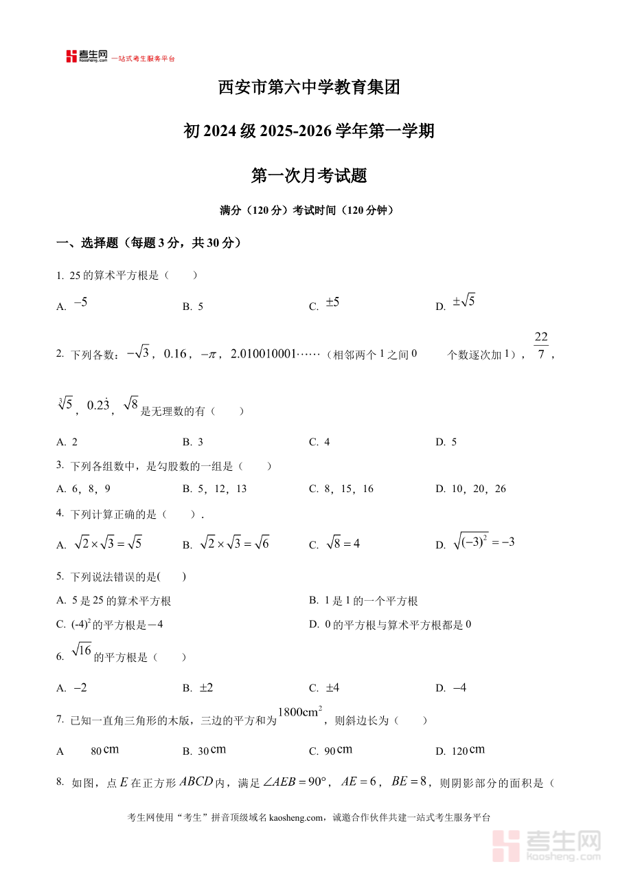 《精品解析:陕西西安市第六中学教育集团2025-2026学年上学期第一次月考八年级数学试题(原卷版)》是针对陕西西安市第六中学教育集团在2025-2026学年上学期组织的八年级数学第一次月考所编制的原卷版备考资料。该资料精准对应特定学年、学期及考试节点,完整呈现本次月考数学试题的原始形态,为使用者提供与实际考试完全一致的试卷参考,是了解该次月考考察框架和内容范围的重要载体,能够帮助使用者快速建立对考试形式和要求的直观认知。