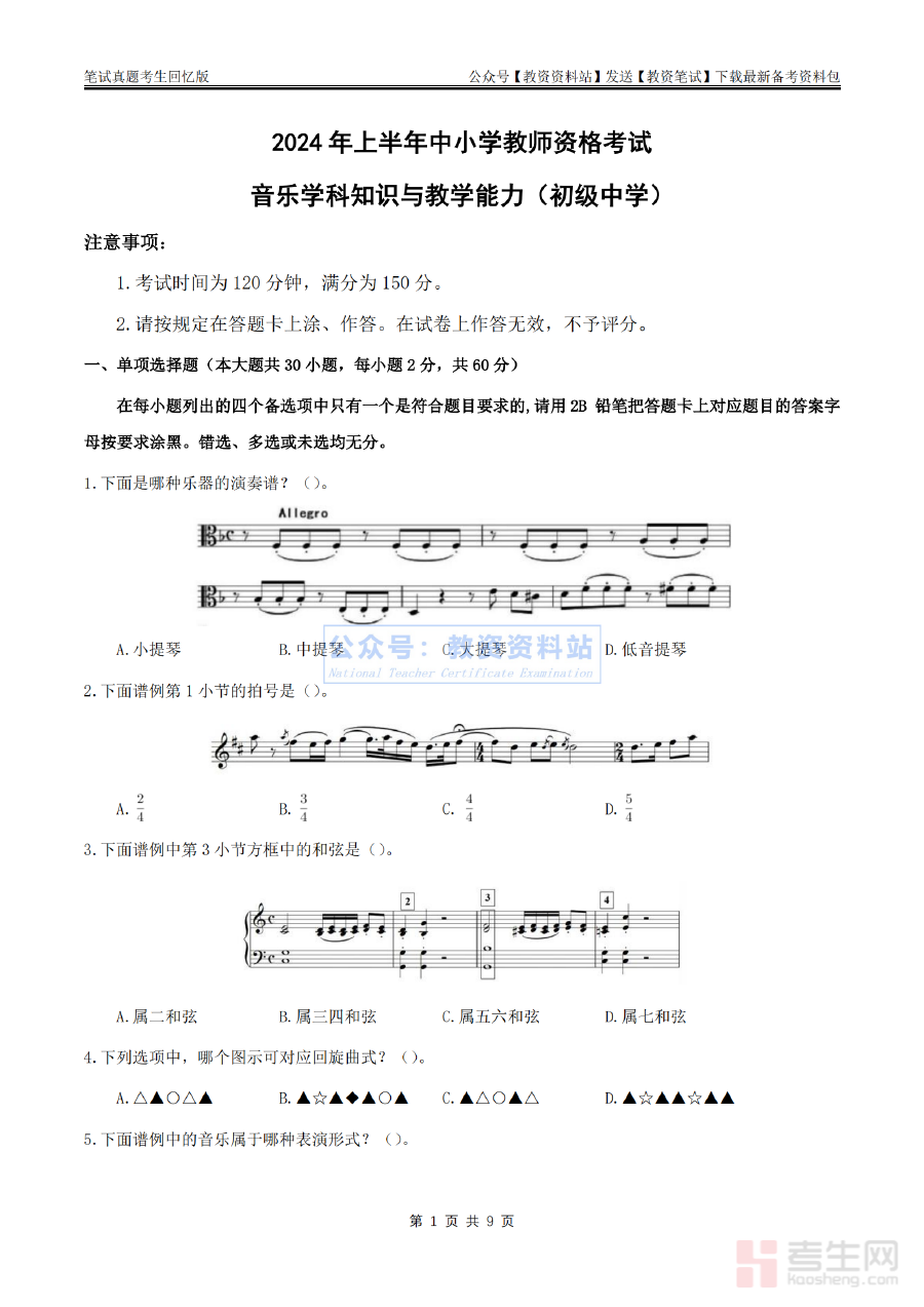 《2024年上半年教师资格证考试《初中音乐》题》是针对2024年上半年国家教师资格证统一考试初中音乐学科的专业备考资料,紧密贴合该考试周期的命题方向与考查需求,为考生提供与考试实际场景高度匹配的练习载体,助力考生提前适应考试的整体框架与考查逻辑,把握学科考查的核心导向。