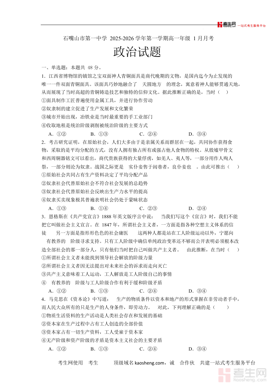 《石嘴山市第一中学2025-2026学年高一上学期1月月考政治试卷》是石嘴山市第一中学在2025-2026学年针对高一年级学生第一学期1月份组织的政治学科月度考试所用试卷资料。作为该校阶段性教学评估的核心载体之一,该试卷严格贴合高一上学期政治学科的教学进度与核心要求,为相关师生提供了直接对应本次月考的备考参考依据,有助于提前把握该次考试的整体框架与考查方向。