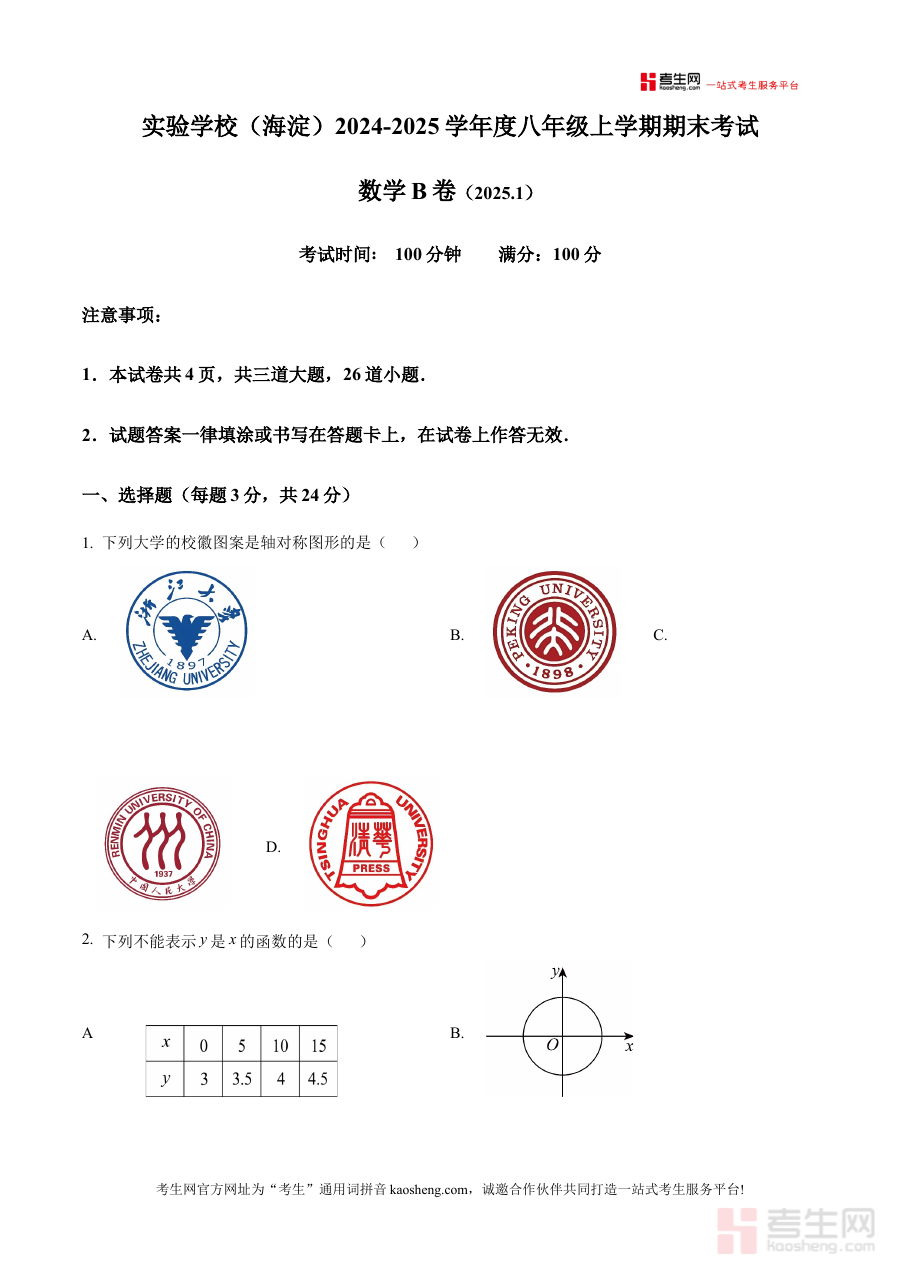 《精品解析:北京市北京实验学校(海淀)2024-2025学年八年级上学期数学期末考试B卷(原卷版)》是针对北京市海淀区北京实验学校2024至2025学年八年级上学期数学期末考试B卷的配套备考资料,聚焦该阶段数学学科的期末检测需求,为使用者提供贴合该校教学进度与考试标准的原卷内容。