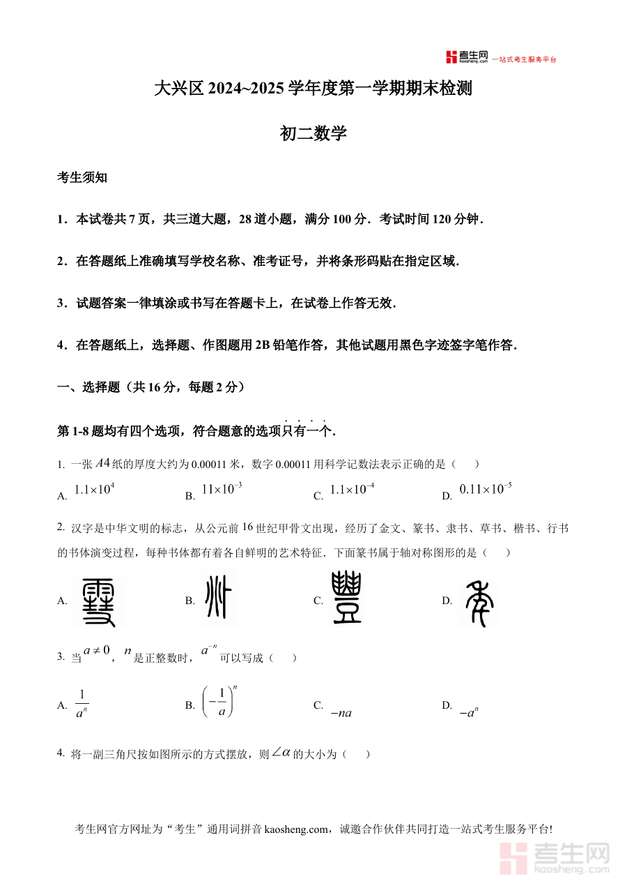《精品解析:北京市大兴区2024-2025学年八年级上学期期末数学试题(原卷版)》是针对北京市大兴区2024至2025学年八年级上学期期末数学考试推出的备考资料,明确覆盖特定地域、学年、学段及学科的期末考试范畴,为该阶段数学学习提供贴合本地教学实际的原卷资源支持。