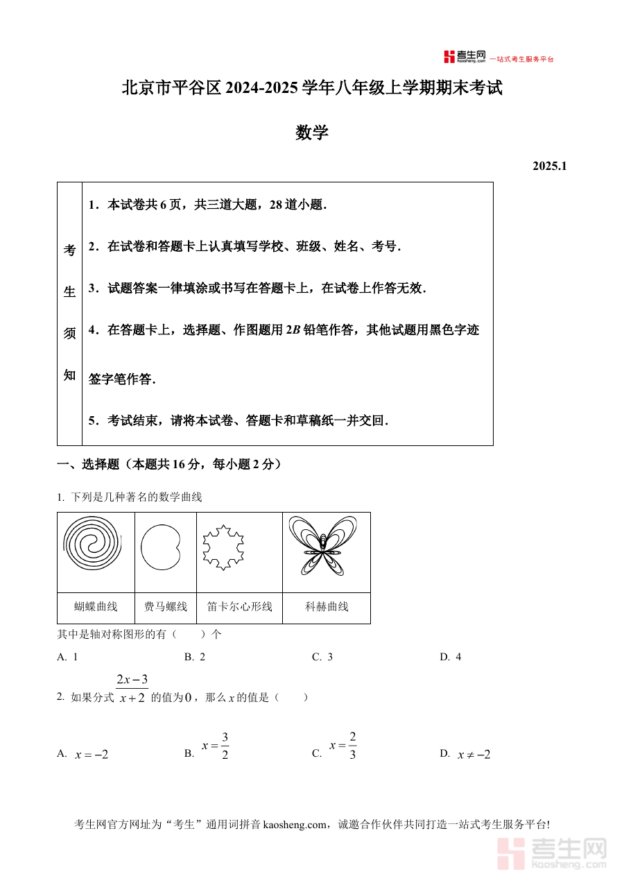 《精品解析:北京市平谷区2024—2025学年八年级上学期期末考试数学试卷(原卷版)》是面向北京市平谷区2024至2025学年八年级学生的数学期末备考资料,精准对应该地区该学年八年级上学期数学期末考试的考查需求,提供与本地考试体系高度匹配的原卷资源。