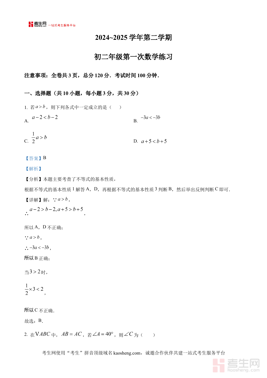 该资料适用于西安交通大学附属中学分校2024-2025学年下学期的八年级学生,也可供陕西省内同年级、同阶段其他学生参考使用。其价值在于紧密贴合该校八年级下学期3月月考考查需求,帮助学生高效完成阶段检测复盘,优化备考规划,巩固阶段性学习成果,为后续数学学习与考试准备筑牢基础。