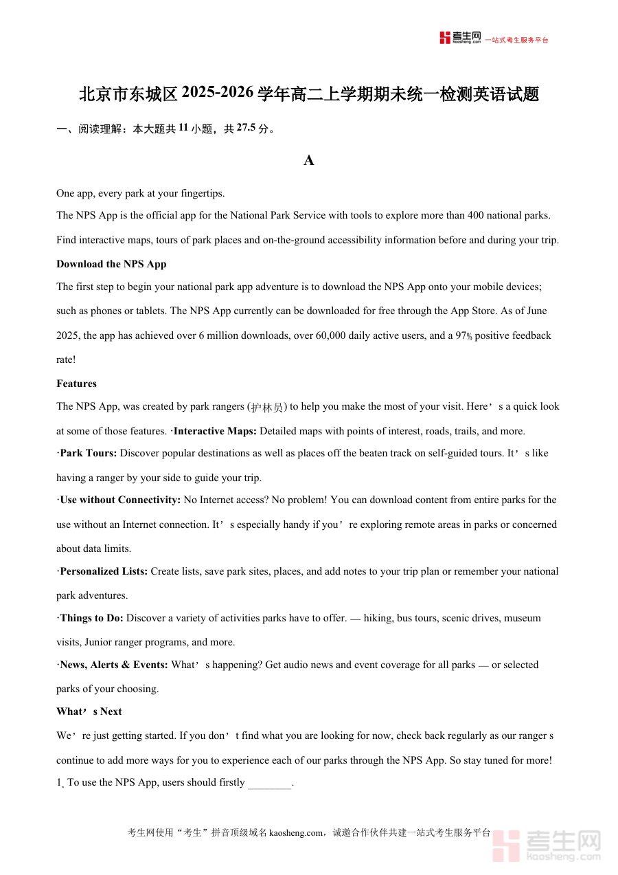 《北京市东城区2025-2026学年高二上学期期末统一检测英语试题(含答案)》是北京市东城区教育部门在2025-2026学年针对高二学生组织的上学期期末标准化检测的英语学科资料,包含试题及配套答案两部分内容,属于该阶段英语学科的核心备考资源,能够体现东城区高二英语教学的阶段目标和检测标准。