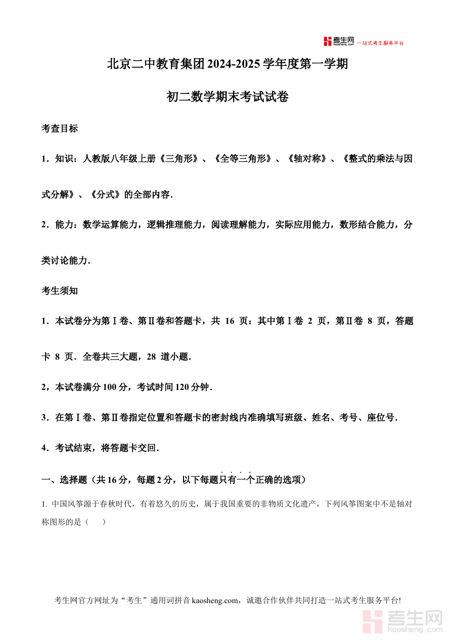 《精品解析:北京市第二中学2024-2025学年八年级上学期期末考试数学试卷(原卷版)》是北京市第二中学针对2024至2025学年八年级上学期数学学科期末考查编制的官方原卷资料,准确反映了该校该学年上学期数学期末考的考查方向与试卷结构,为使用者提供了与实际考试高度一致的备考载体,是适配该阶段数学学习需求的核心备考资源之一。