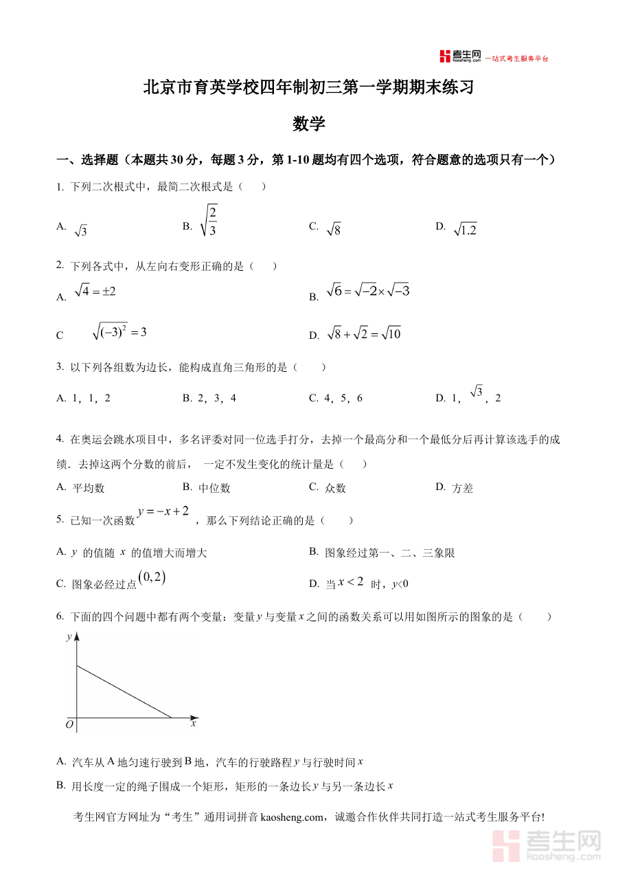 《精品解析:北京市育英学校2024-2025学年八年级上学期期末考试数学试卷(四年制)(原卷版)》是适配北京市育英学校四年制教学体系的八年级上学期数学期末检测专用备考资料,对应2024至2025学年的上学期期末考核阶段,贴合该校四年制八年级数学学科的教学进度与期末评价标准,为相关群体提供与学校期末考直接关联的学习参考资源。