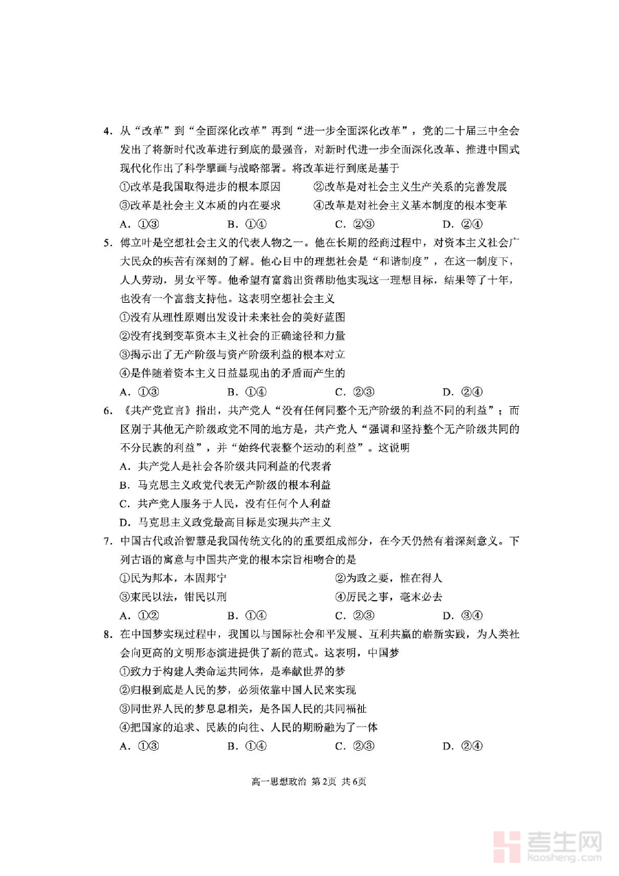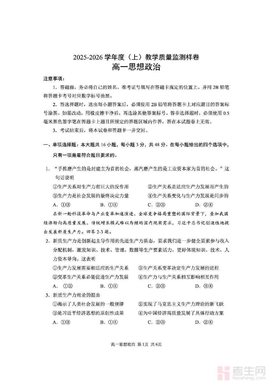 作为教学质量监测样卷,该资料可有效支持高一学生开展自我学情诊断,帮助其清晰认知自身政治学科知识的掌握状况与薄弱环节;同时也为教师提供阶段教学效果评估的工具,辅助教师精准调整教学策略与备考规划,确保教学实施与区域质量监测目标保持一致,提升教学的针对性与有效性。