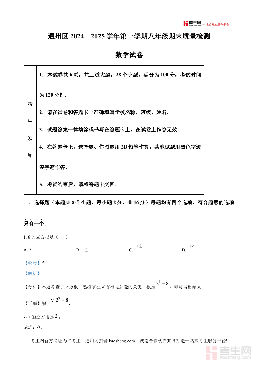 精品解析:北京市通州区2024-2025学年八年级上学期期末考试数学试卷(解析版)是针对北京市通州区该学年八年级上学期数学期末考试的专业备考资料,紧密贴合当地教学大纲与考试命题方向,为学生提供对应阶段数学学习成果的检验载体及备考指导,助力学生熟悉期末考试的考查模式与内容范围。