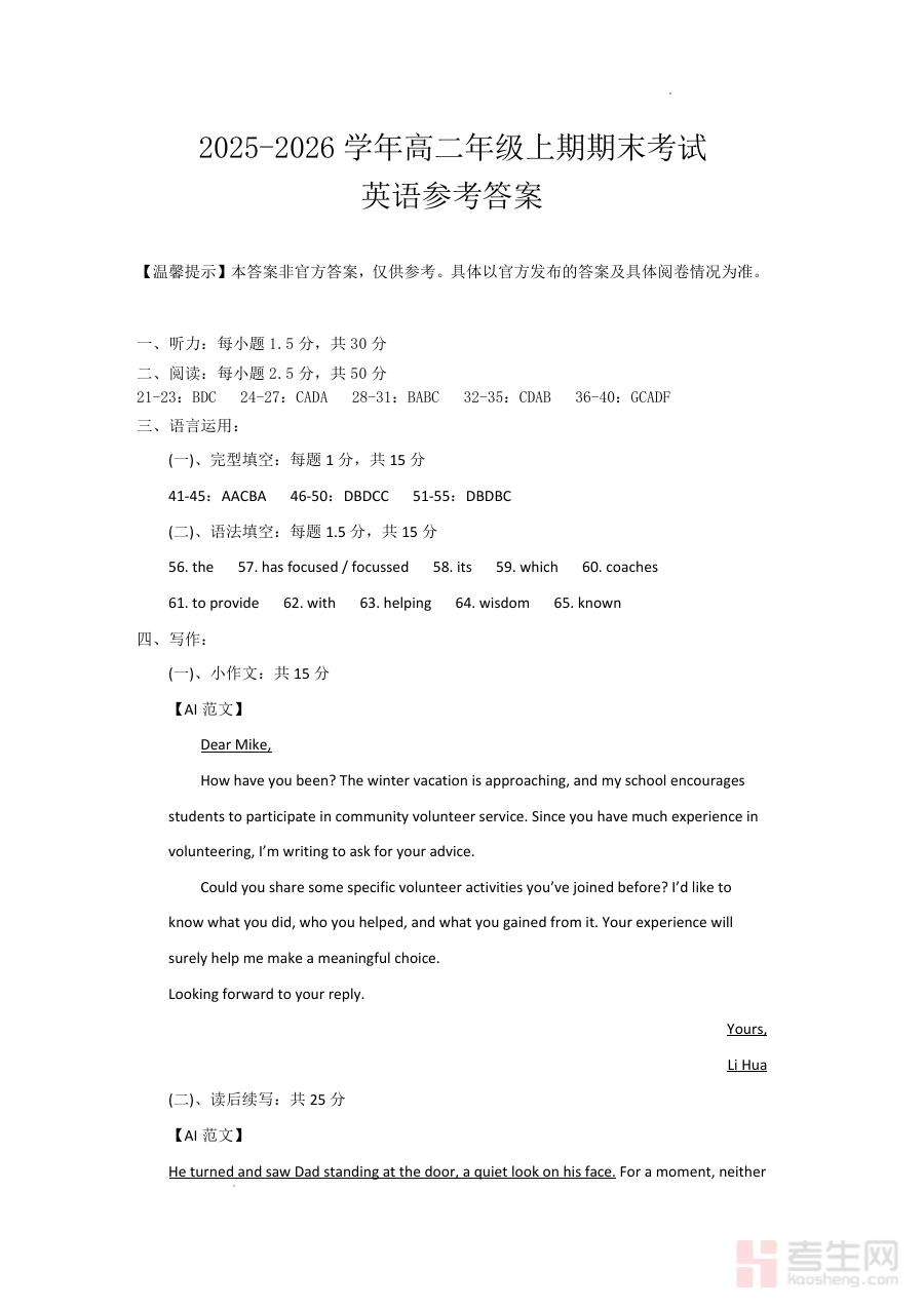 《自贡市2025~2026学年高二年级上学期期末考试英语答案》是针对四川省自贡市2025至2026学年高二年级上学期期末英语考试的配套答案资料。该资料对应高中二年级上学期的阶段性终结考试场景,是英语学科考试结束后用于核对答题结果的辅助材料,能够为使用者提供考试各题目的标准解答参考方向,为后续的学习效果评估奠定基础。