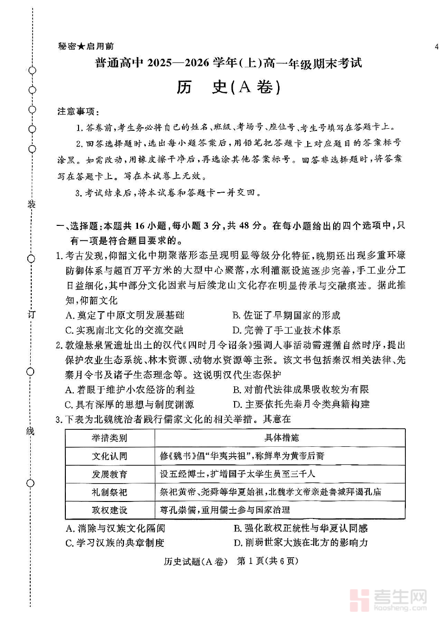 《河南省普通高中2025-2026学年(上)高一年级期末考试历史A卷》是针对河南省普通高中2025至2026学年第一学期高一年级历史学科期末考试设计的标准化备考资料,契合该地区高一历史教学进度与期末检测的核心要求,为学生提供与正式考试高度匹配的练习资源。