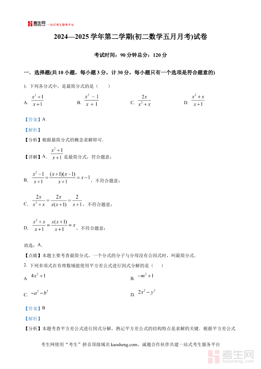 《精品解析:陕西省西安市第七十中学2024—2025学年下学期5月月考八年级数学试题(解析版)》是针对陕西省西安市第七十中学在2024至2025学年第二学期5月组织的八年级数学月考所编制的配套解析资料,属于初中阶段数学学科阶段性考试的专业备考辅助材料。该资料紧密结合本次月考的命题背景与考查方向,为使用者提供了对考试内容的系统解读,帮助相关群体准确把握考试的核心评价要点与知识覆盖范围。