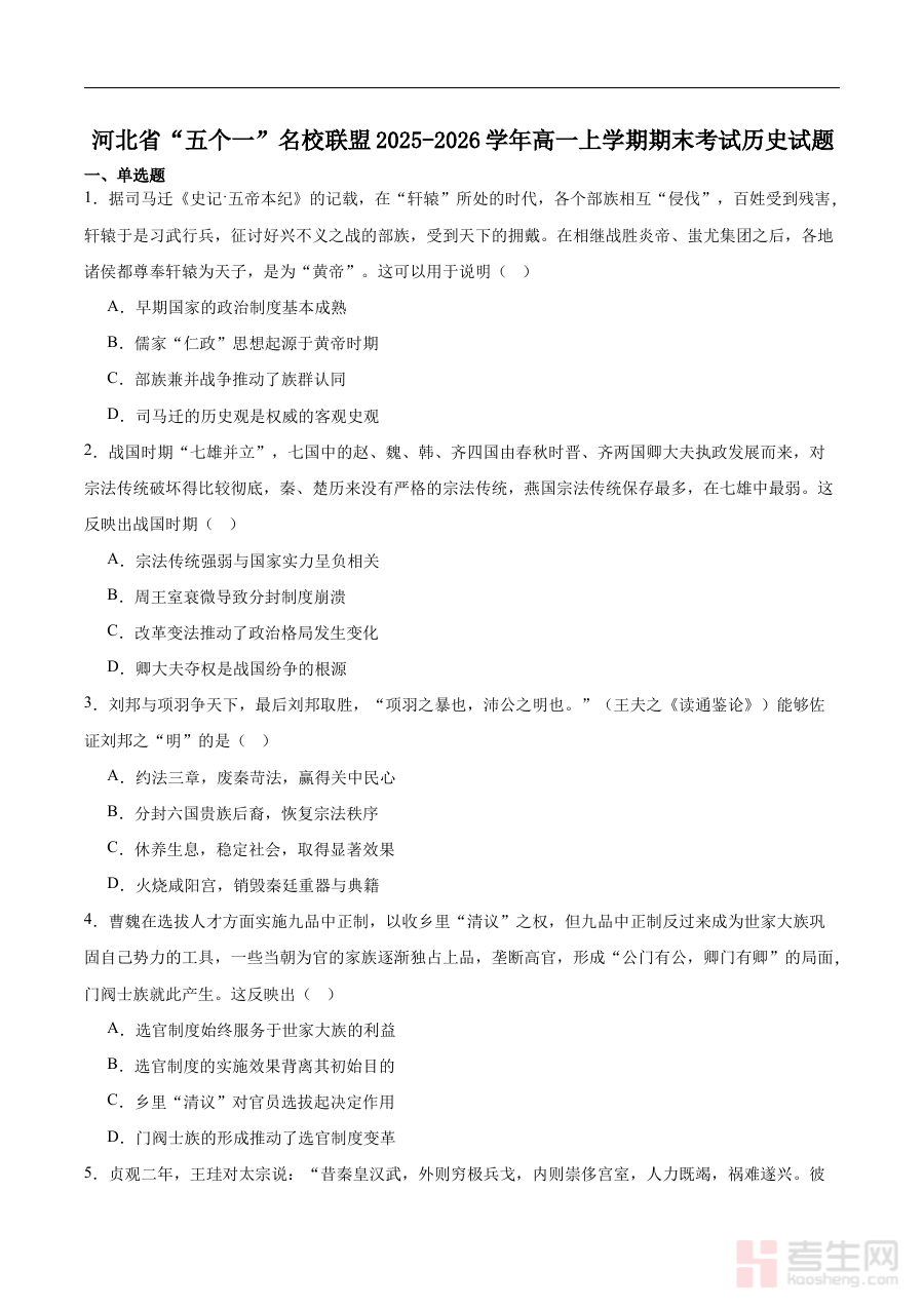 《河北省“五个一”名校联盟2025-2026学年高一上学期期末历史试卷(含答案)》是河北省“五个一”名校联盟在2025-2026学年第一学期期末针对高一学生推出的历史学科标准化检测资料,包含完整试卷及配套参考答案。作为区域内优质校联盟联合编制的期末检测资源,该资料紧密贴合高一上学期历史学科的教学进度与考核标准,为该阶段历史学习提供了具有区域代表性的规范化参考依据。