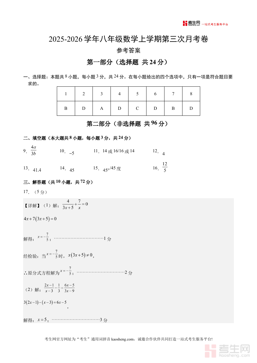 《八年级数学第三次月考卷(参考答案)(新教材北京版)》是针对北京地区使用新教材的八年级学生数学学科第三次月度考试设计的配套参考资料。它与对应的月考卷内容高度匹配,为使用者提供了精准的答案依据,是该阶段数学考试备考过程中用于核对作答、明确标准的重要辅助材料,能够帮助使用者快速了解考试答题的规范与方向。