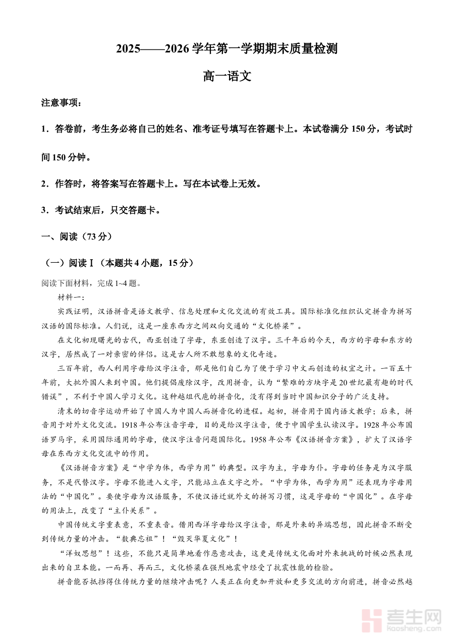 《内蒙古赤峰市松山区2025-2026学年高一上学期期末语文试题(含答案)》是针对内蒙古赤峰市松山区特定学段与时间节点的标准化语文考试备考资料,明确覆盖2025-2026学年就读高一的学生群体,聚焦上学期期末这一关键阶段的语文学科考查需求,为学生提供与当地教学大纲及考试标准高度契合的练习载体,搭建起连接日常学习与期末检测的桥梁。