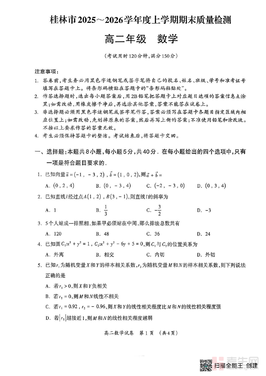 《桂林市2025-2026学年度上学期期末质量检测高二年级数学 桂林市2025-2026学年度上学期期末质量检测高二数学》是针对桂林市2025至2026学年度上学期高二年级数学学科的期末质量检测相关备考资料,明确覆盖该学年度上学期的时间范围,聚焦高二年级数学学科的期末检测需求,为该阶段的数学学习提供对应的备考支持,体现了区域教育质量监测的阶段性特征。