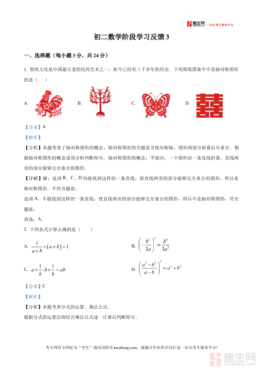 《精品解析:北京市三帆中学2025-2026学年上学期八年级数学阶段学习反馈3(解析版)》是北京市三帆中学针对本校2025-2026学年上学期八年级数学学科开展的第三次阶段性学习反馈的解析类备考资料,聚焦该阶段数学学科的学习成果检测需求,为使用者提供专业的解析支持。