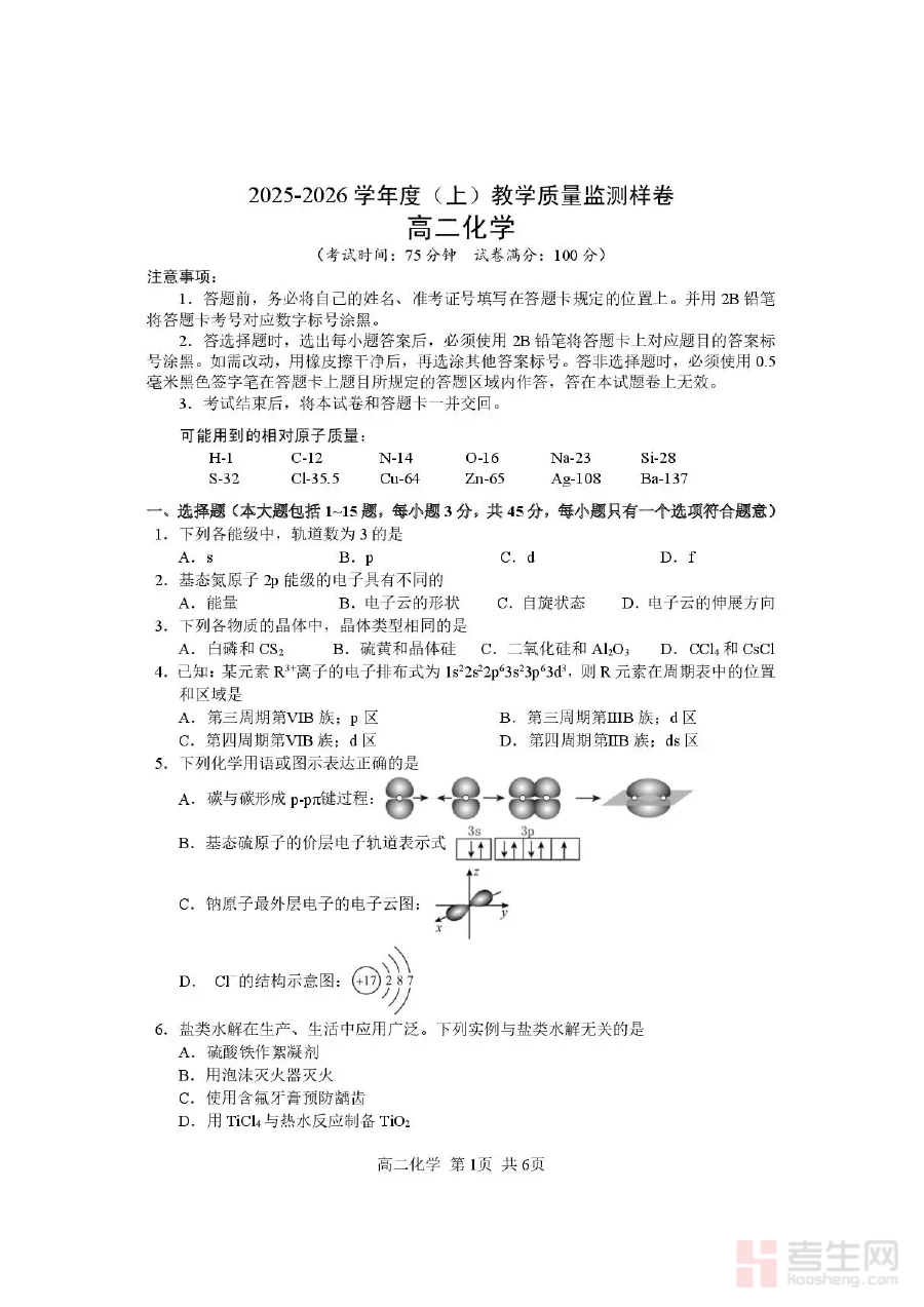 该资料适用于攀枝花市2025-2026学年度高二上学期的在校学生以及承担高二化学教学任务的教师群体。对于学生而言,通过使用样卷可清晰明确阶段学习目标和监测重点,提升备考的针对性与有效性;对于教师来说,样卷能为教学质量监测的实施提供标准化参考框架,助力更科学地开展教学评价、个性化指导及教学质量提升工作。