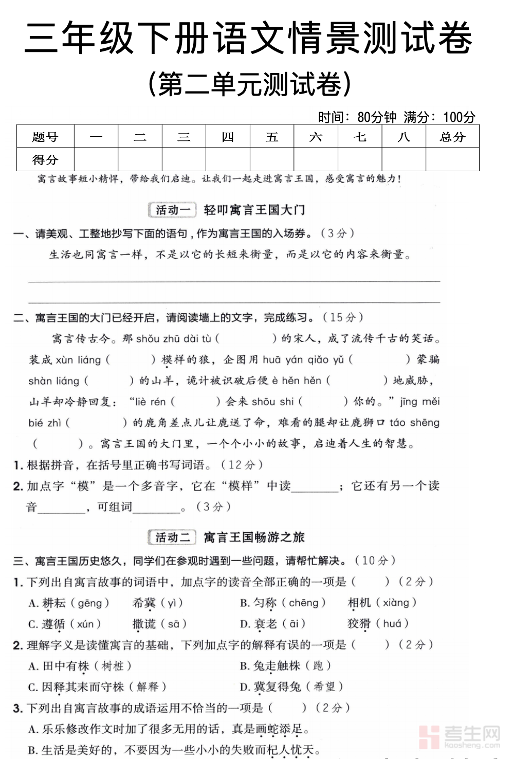 小学语文第二单元达标卷(三年级下)紧扣部编版三年级下册语文教材第二单元知识点,同步单元教学重点,全面覆盖生字书写、词语辨析、句子练习、课文内容填空、课内阅读、课外阅读及看图写话等核心考查内容。试卷题型贴合小学单元检测要求,难度适中、梯度清晰,注重考查基础知识掌握、阅读理解能力、语言表达与简单写作,能真实反映学生本单元学习情况。适合三年级学生进行单元自测、课后巩固、错题整理、考前复习,及时查漏补缺,夯实语文基础,提升语文综合能力。请添加微信 18617049513 进专属群,获取更多免费资源!