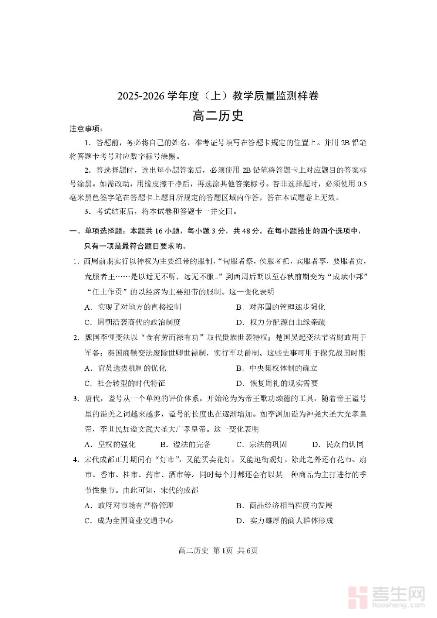 本样卷的适用人群为攀枝花市2025-2026学年度高二上学期的历史学科学生及相关教师。对于学生而言,通过样卷练习可提前适应监测模式,提升应试能力;对于教师而言,样卷可作为阶段性教学效果评估的重要工具,助力优化教学策略,促进教学质量的提升,共同推动高二历史教学目标的有效达成。