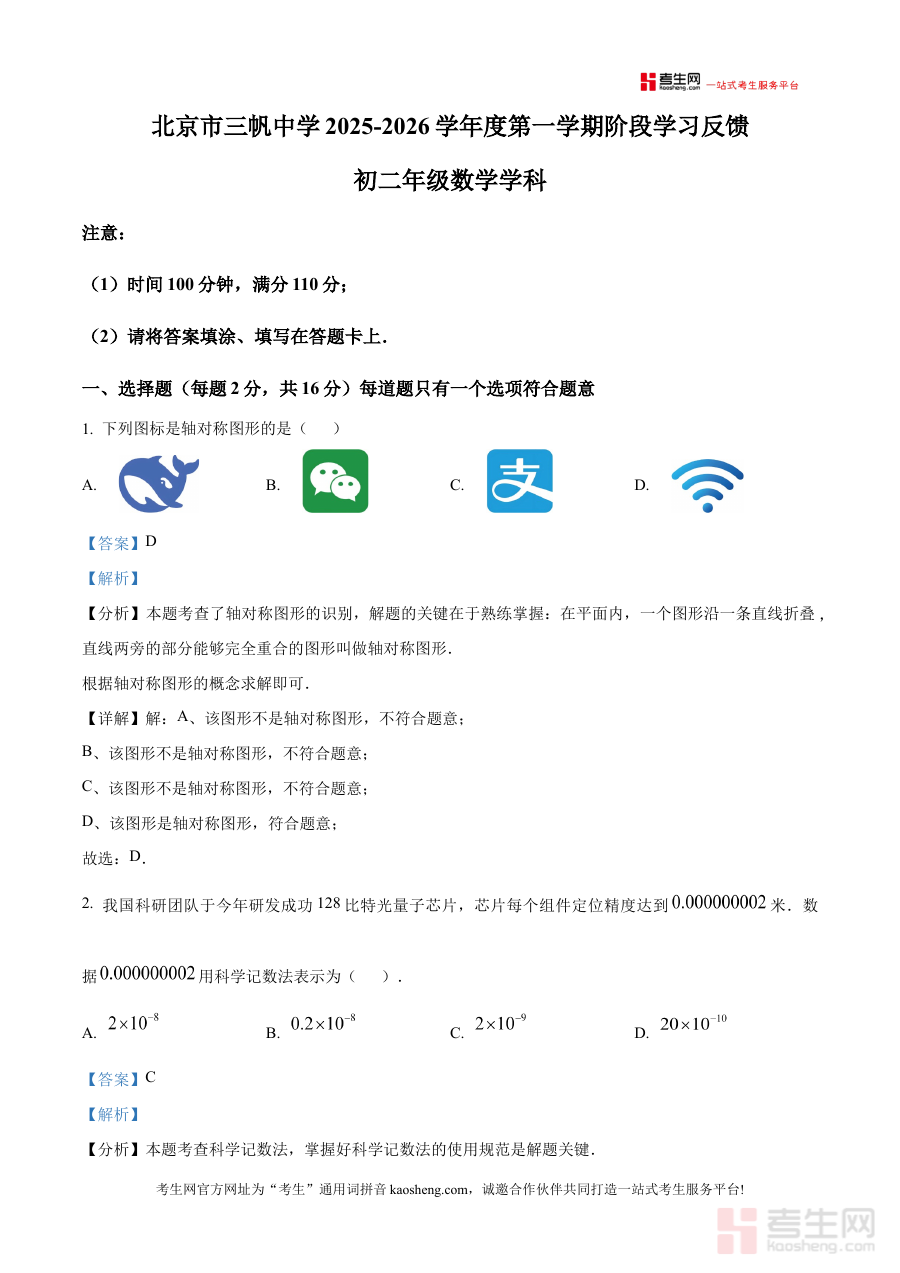 本资料适用于北京市三帆中学2025-2026学年八年级学生,以及希望了解该校月考命题特点、进行同阶段数学学习检测的其他八年级学生。它不仅可作为阶段学习效果的检测工具,还能通过系统的解析梳理知识体系,为后续学习与备考提供清晰的方向指引,助力使用者提升阶段学习质量。
