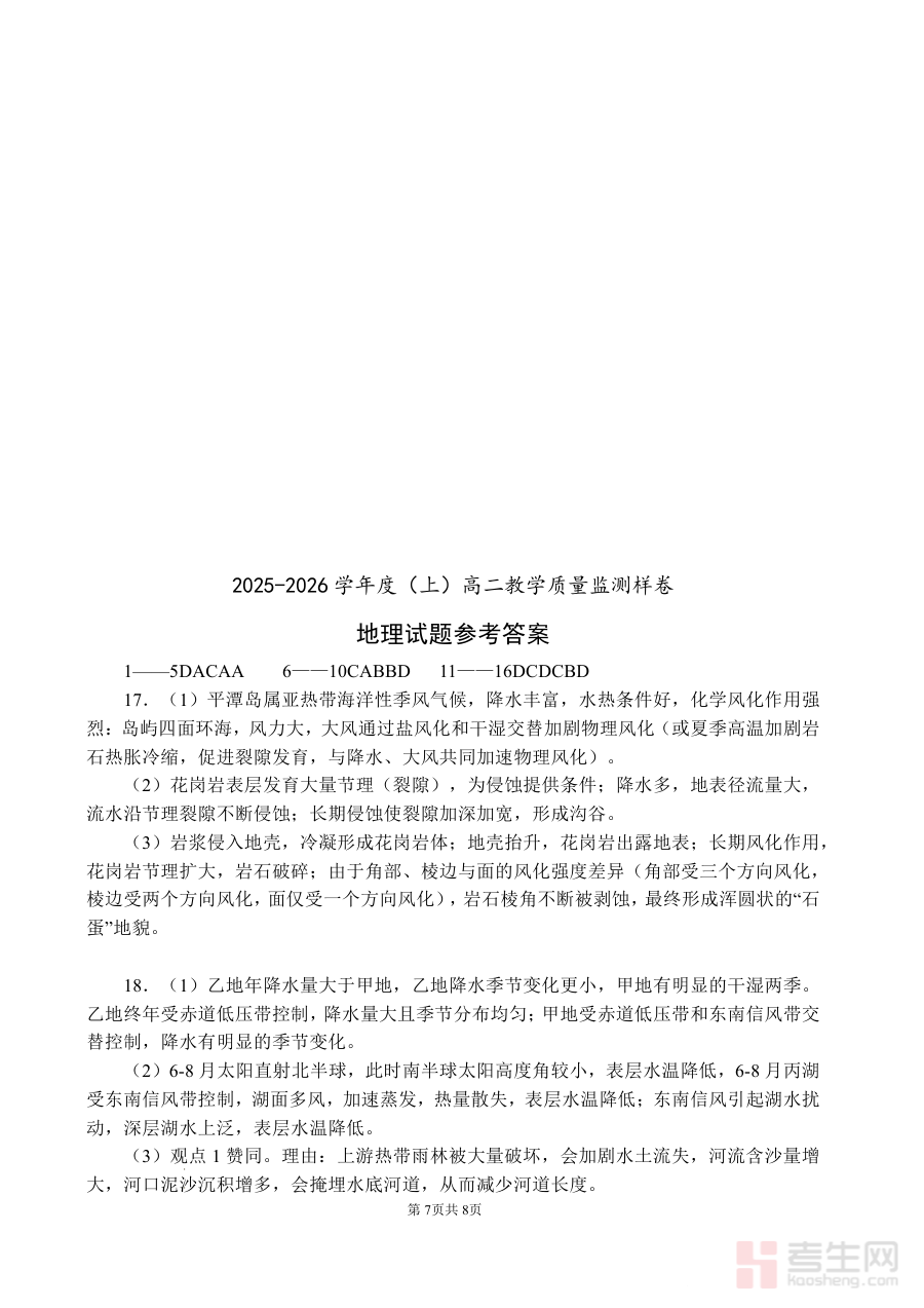 该资料的适用人群主要为攀枝花市2025-2026学年度高中二年级的学生及其地理教师。对于学生而言,通过参考该答案能更准确把握样卷考查方向与要求,提升阶段检测有效性;对于教师来说,借助答案可高效开展教学评估工作,助力教学质量提升,共同推动高二上学期地理学科教学目标达成。