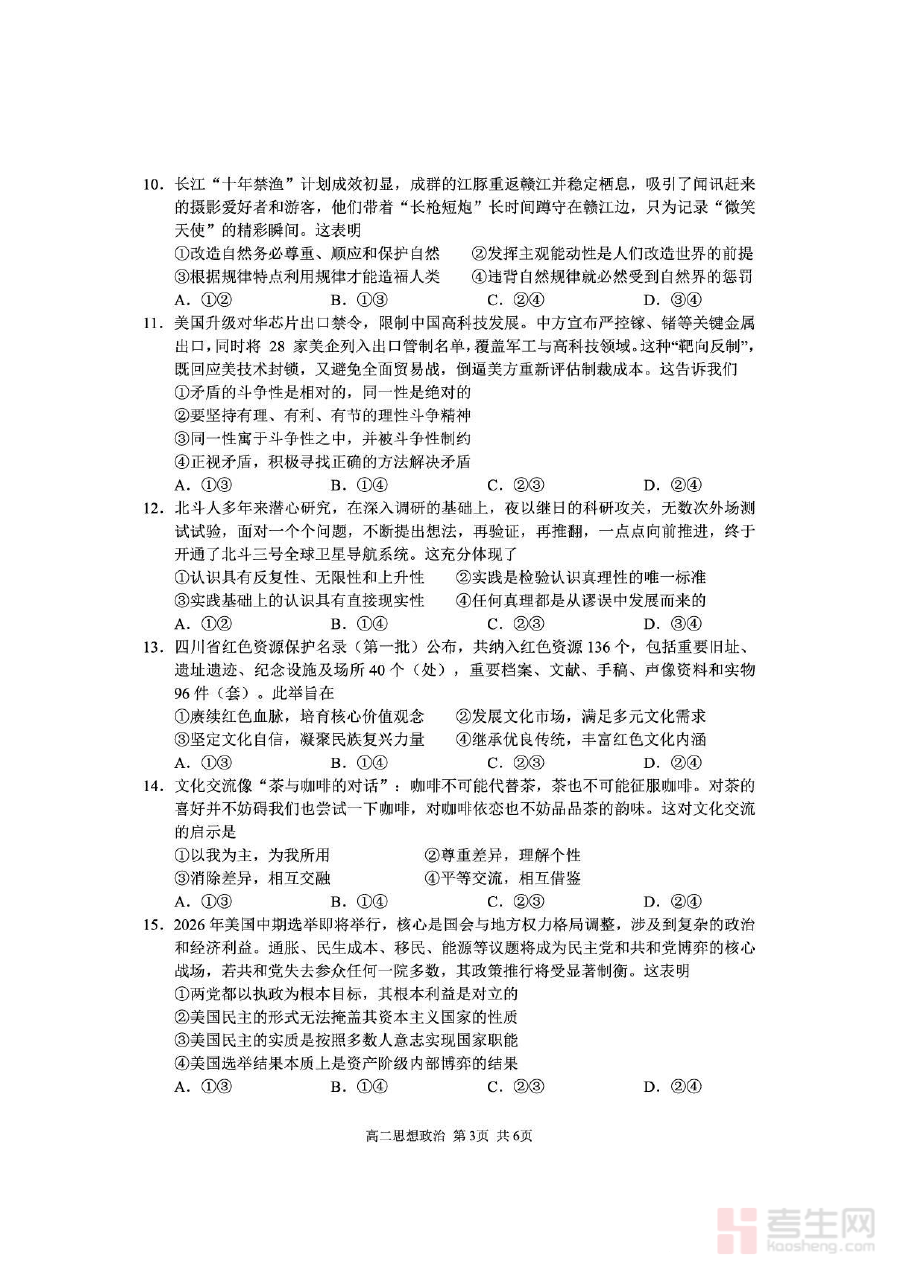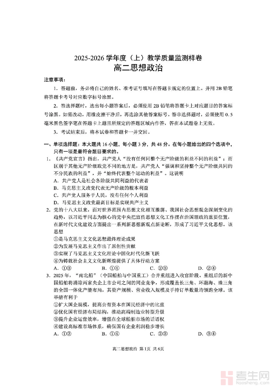 此样卷主要适用于攀枝花市2025-2026学年度高二上学期的政治学科学生及任课教师,通过样卷的使用,学生可增强阶段学习的针对性与目标性,教师可优化教学策略以适配学生实际需求,共同推动教学质量提升与学生学业进步。