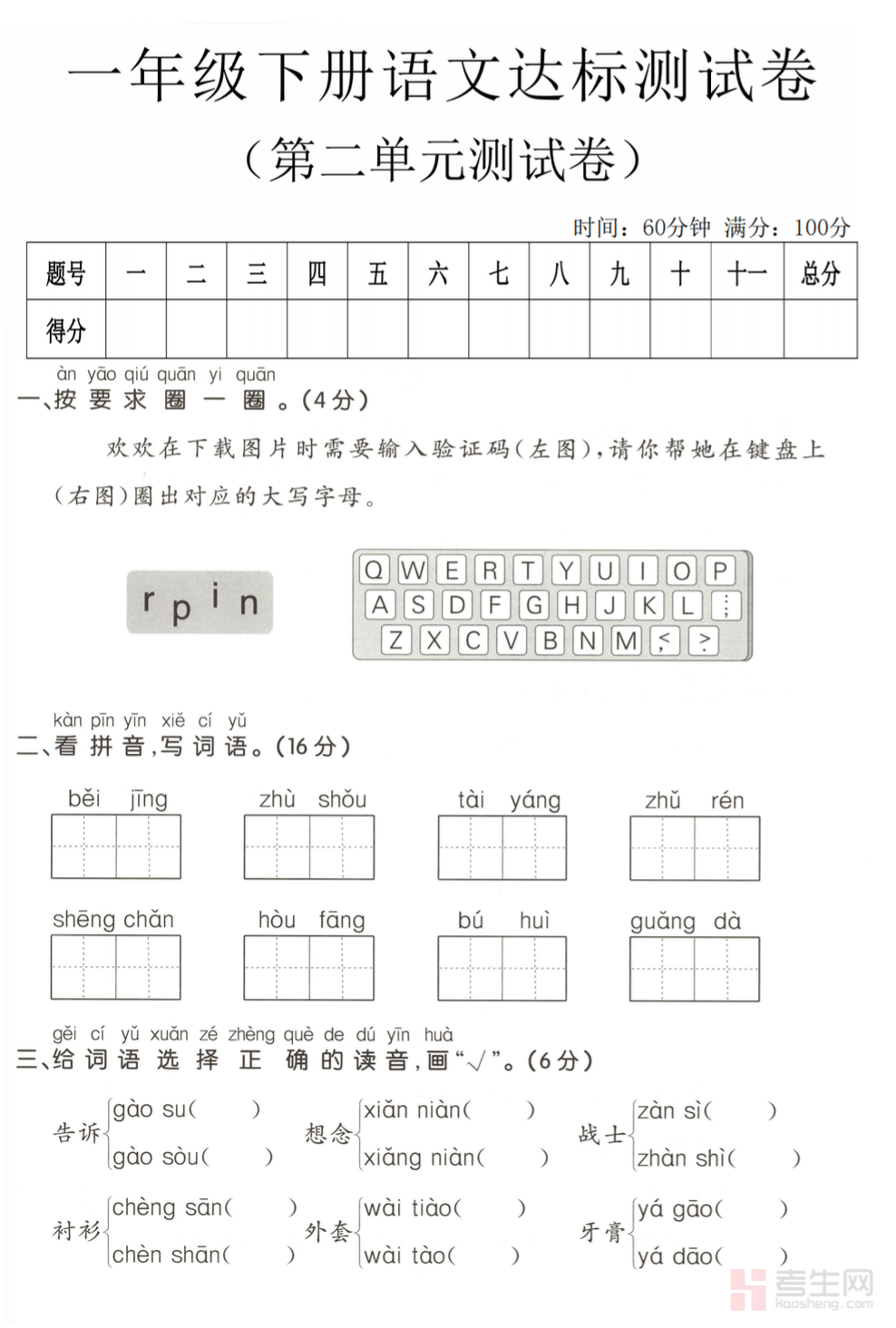 小学语文第二单元达标卷(一年级下)紧扣部编版一年级下册语文教材第二单元教学内容,同步单元重难点,全面覆盖拼音认读、生字书写、词语搭配、句子练习、课文背诵、简单阅读理解和看图写话等基础知识点。试卷题型丰富有趣、难度适中,贴合低年级单元检测要求,重点考查识字写字能力、拼音运用能力、语句表达能力和课文掌握程度,题型设计符合一年级学生认知特点。适合一年级学生进行单元自测、课堂巩固、课后练习和考前复习,帮助孩子及时查漏补缺,扎实打好语文基础,提升语文学习兴趣与应试能力。请添加微信 18617049513 进专属群,获取更多免费资源!
