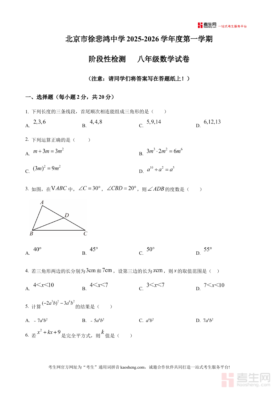 《精品解析:北京市徐悲鸿中学2025-2026学年 上学期 阶段性检测 八年级数学试卷(11月)(原卷版)》是针对北京市徐悲鸿中学特定学年学期及月份的数学阶段性检测资料。该资料对应2025-2026学年上学期11月的八年级数学阶段性检测,属于学校内部阶段性评估的原卷呈现,为相关师生提供了与实际检测完全一致的试卷形式,是了解本次阶段性检测具体考查载体的重要资源,能让使用者直接接触到本次检测的原始试卷结构与呈现方式。