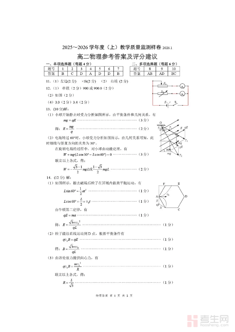 《攀枝花市2025-2026学年度高二(上)教学质量监测样卷物理答案》是针对攀枝花市2025至2026学年度高中二年级上学期教学质量监测样卷的物理学科配套答案资料。作为该学年度阶段性教学质量监测体系的重要组成部分,该资料与对应样卷相匹配,为相关教学活动及备考工作提供必要的标准参考依据。