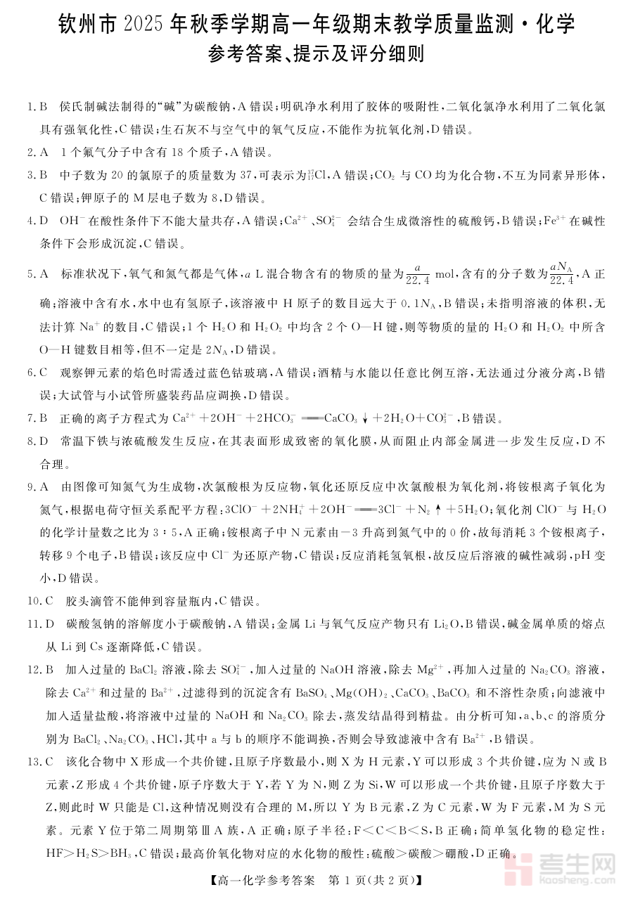 该资料适用于钦州地区2025-2026学年秋季学期的高一学生、化学教师及学生家长。对于学生,能通过核对答案实现自我检测与学习反思;对于教师和家长,可借助其把握考试评价方向,辅助开展针对性教学指导或学习监督,具有阶段检测与备考规划的双重实用价值。