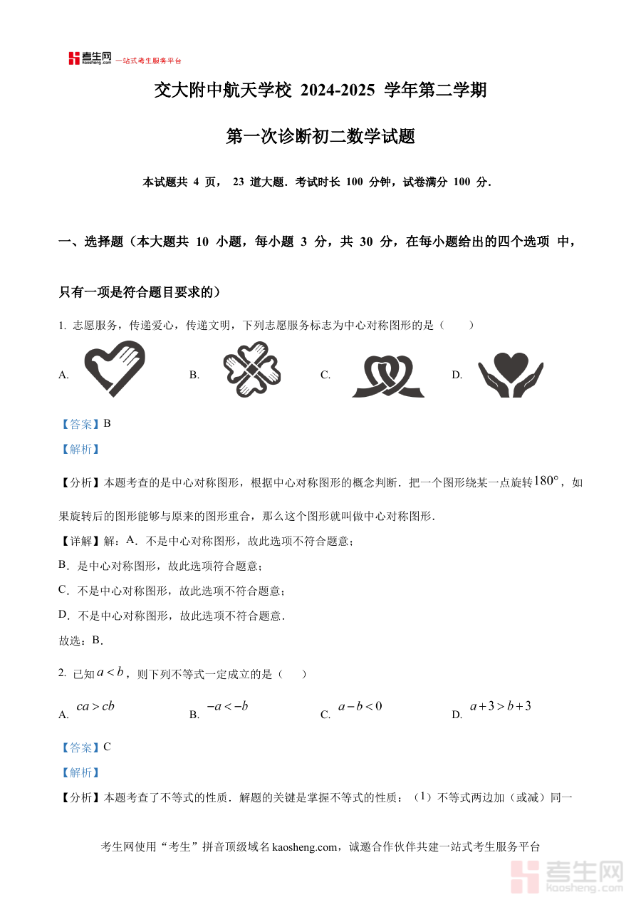 本资料主要适用于西安交大航天学校2024-2025学年下学期的八年级学生及数学教师。对于学生而言,它能帮助其提前熟悉月考的考查形式与难度水平,通过解析内容掌握正确的解题方法,提升备考效率与应试能力;对于教师而言,可借助这份资料了解学生在本次月考中的可能表现,为后续教学内容的调整与强化训练提供依据,共同促进教学质量与学习效果的提升。