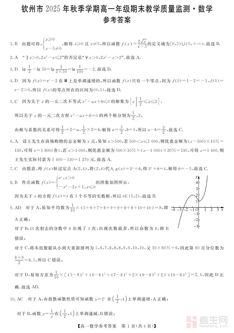 《钦州2025-2026秋季期末高一数学答案》是针对广西钦州地区2025至2026学年第一学期高一数学期末考试设计的配套答案资料,紧密贴合该地区高中数学教学进度与期末检测的核心需求,为相关考试的备考工作提供直接且专业的参考依据。该资料依托当地教育教学实际情况开发,旨在辅助使用者高效完成与期末数学考试相关的各项准备工作。