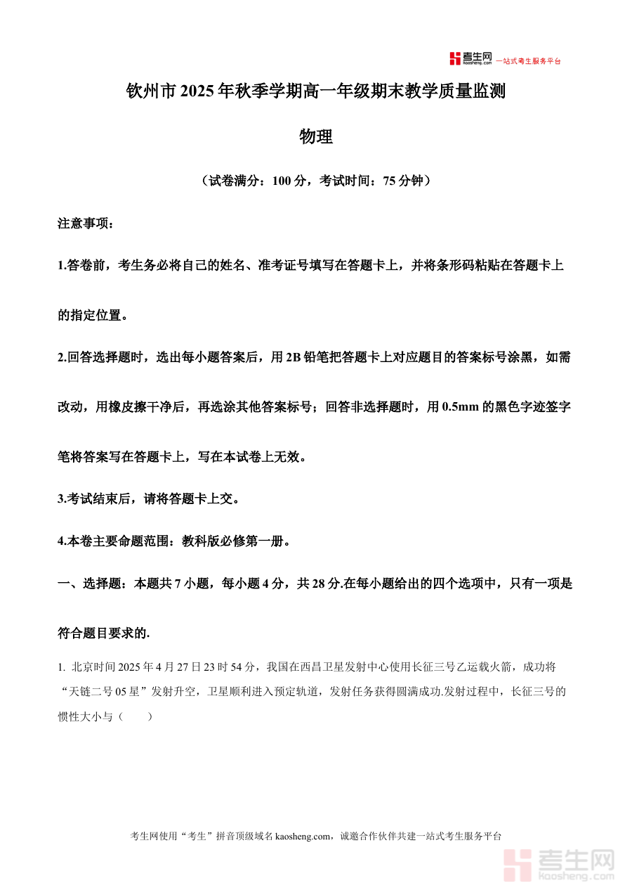 本资料适用于钦州地区2025-2026学年秋季学期在读的高一学生,尤其适合需要系统梳理本学期物理知识、强化期末备考效果的学生使用。通过使用该资料进行模拟练习与自我检测,学生能够有效巩固所学物理知识,熟悉期末检测的考查形式与节奏,提升应对期末检测的信心与实际能力,为后续高中物理学习奠定坚实的基础。