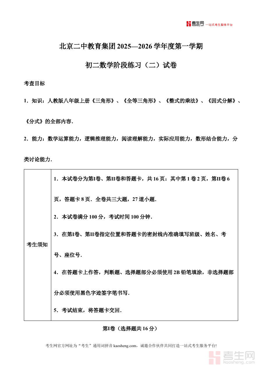 《精品解析:北京市第二中学2025-2026学年八年级上学期12月月考数学试卷(原卷版)》是北京市第二中学针对2025-2026学年八年级上学期12月设置的数学月考原卷类备考资料,属于初中阶段中期学业检测范畴的教学辅助资源,能够为相关师生提供该学期特定时间节点的考试场景还原与内容参考,帮助对接学校阶段性教学目标与测评要求,是贴合八年级上学期中期学习进度的针对性资料。