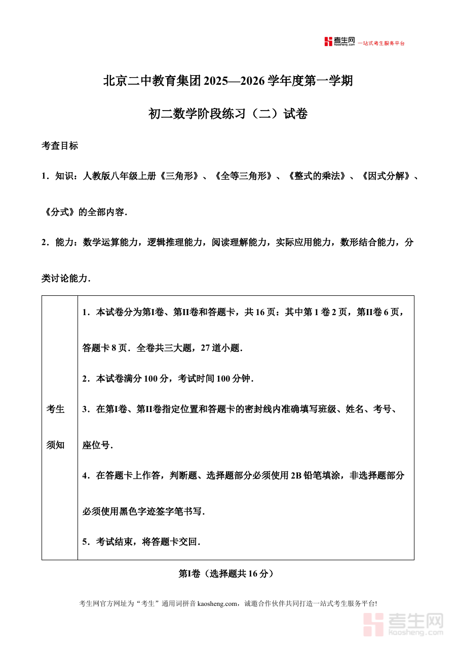 此资料主要适用于北京市第二中学八年级上学期的在读学生,同时也可为同年级其他学校的学生提供具有参考价值的校考范例,其核心价值在于通过呈现校考的题型结构与考查方向,辅助学生进行阶段性学习效果的全面检测,并为下一阶段的备考规划奠定坚实基础,有效提升复习的针对性与学习效率。
