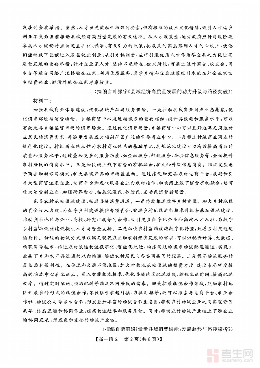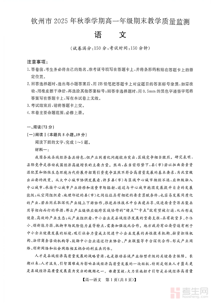 《钦州2025-2026秋季期末高一语文试卷》是钦州地区针对2025至2026学年秋季学期高一学生设计的语文期末检测资料,属于该阶段学业评估的重要参考载体。它紧密贴合钦州本地高一语文教学的阶段性要求,能够帮助使用者直观了解该地区高一语文期末考查的整体方向与核心侧重点,为相关群体提供与区域期末检测直接相关的备考依据。