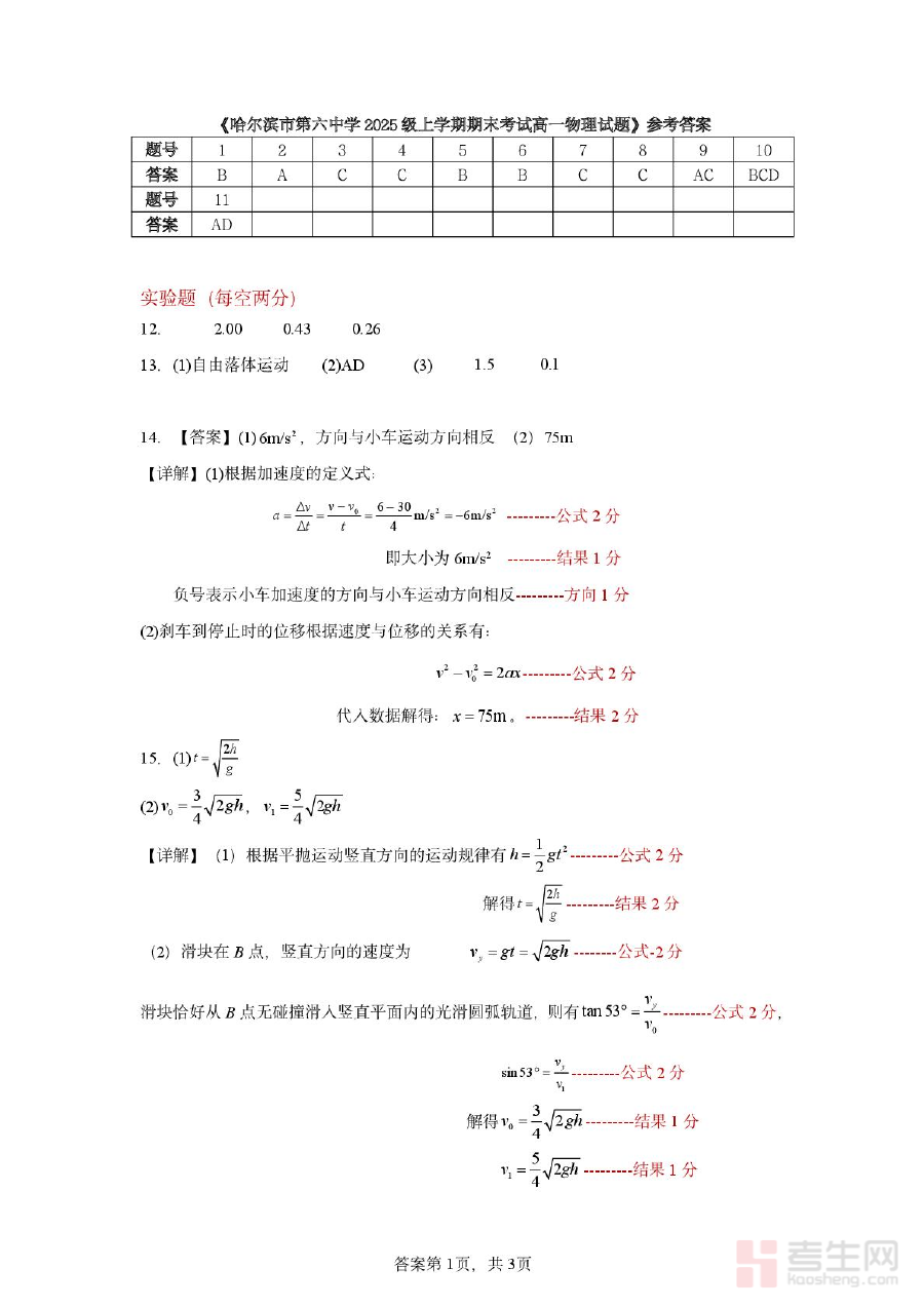 《哈六中高一物理试题与答案 2025级上学期期末考试高一物理试题参考答案》是哈尔滨第六中学针对2025级高一学生上学期物理学科期末考试编制的配套资料,包含该次期末检测的完整试题及对应的参考答案。作为当地重点中学的期末考核资料,其内容与该校高一物理上学期的教学内容、课程标准及期末评价要求高度匹配,能够为相关使用者提供贴合学校教学实际的权威参考。