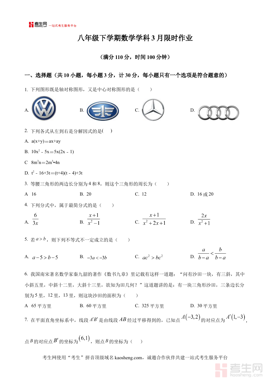 《精品解析:陕西省西安市陕西师范大学附属中学2024-2025学年八年级下学期第一次月考数学试题(原卷版)》是针对陕西省西安市陕西师范大学附属中学特定学年学期与考试阶段的数学学科备考资料,明确对应2024-2025学年八年级下学期第一次月考场景,为使用者提供与该校本次月考完全匹配的原始试题呈现形式,帮助师生快速把握该次考试的命题背景与考查方向框架,是贴合该校阶段性教学进度与考查需求的针对性资源。